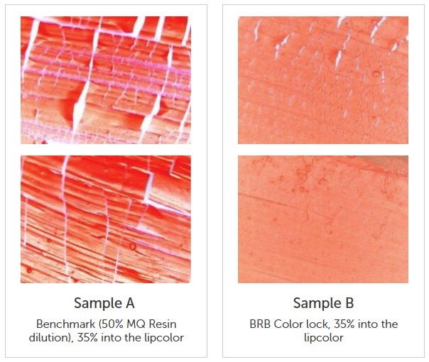 BRB Color Lock is a new film former based on the established silicone MQ resin technology in a unique formulation to improve the flexibility of the film. BRB Color Lock has been specially designed to formulate a wide range of color cosmetic applications such as lipstick, mascara, eye liner, eye shadow and foundation.