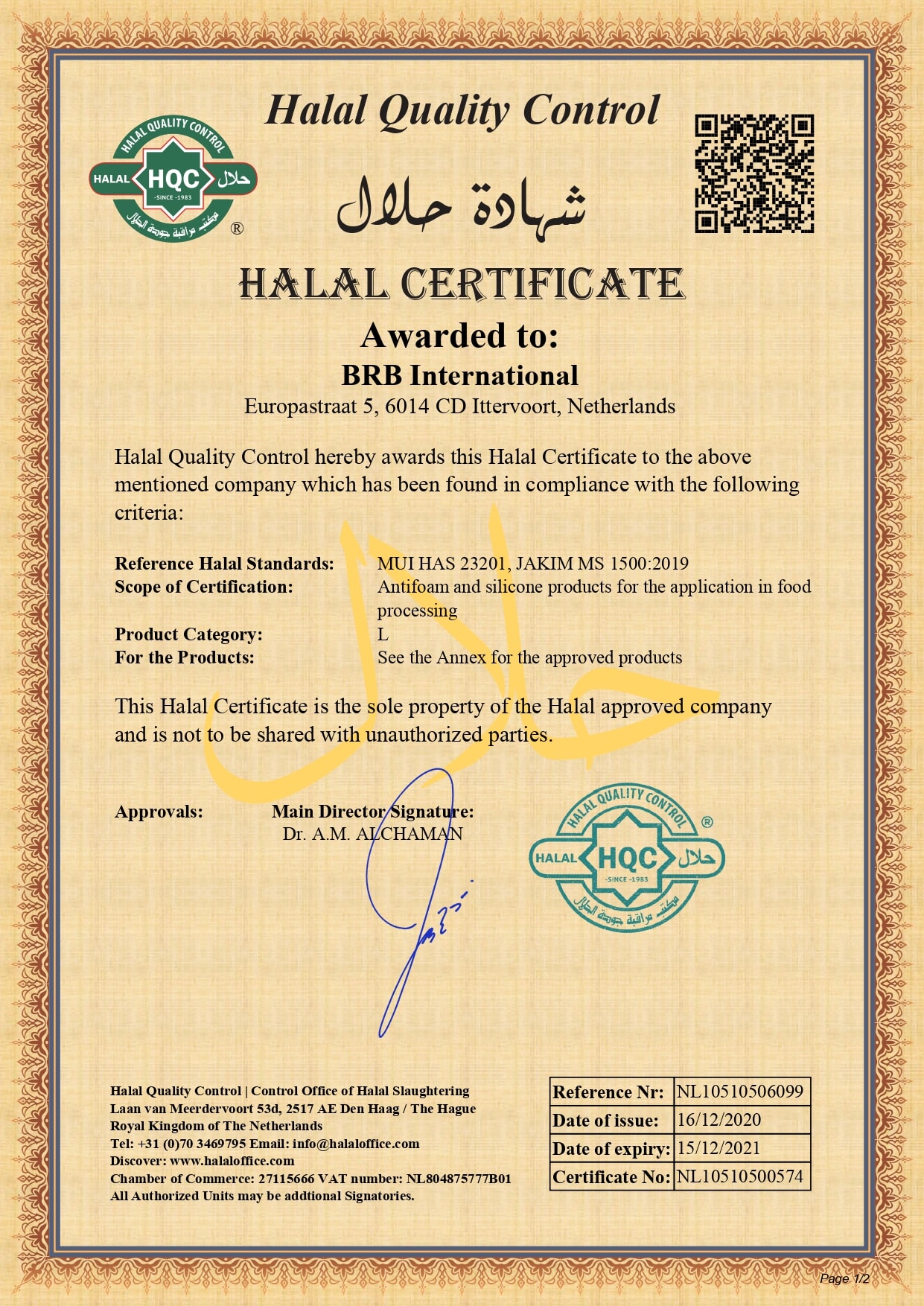The Halal Certificate is meeting both Halal standard by Indonesia’s MUI HAS 23201 and Malaysia’s JAKIM MS 1500: 2019. BRB International BV manufactured the following range of products in Netherlands:-
